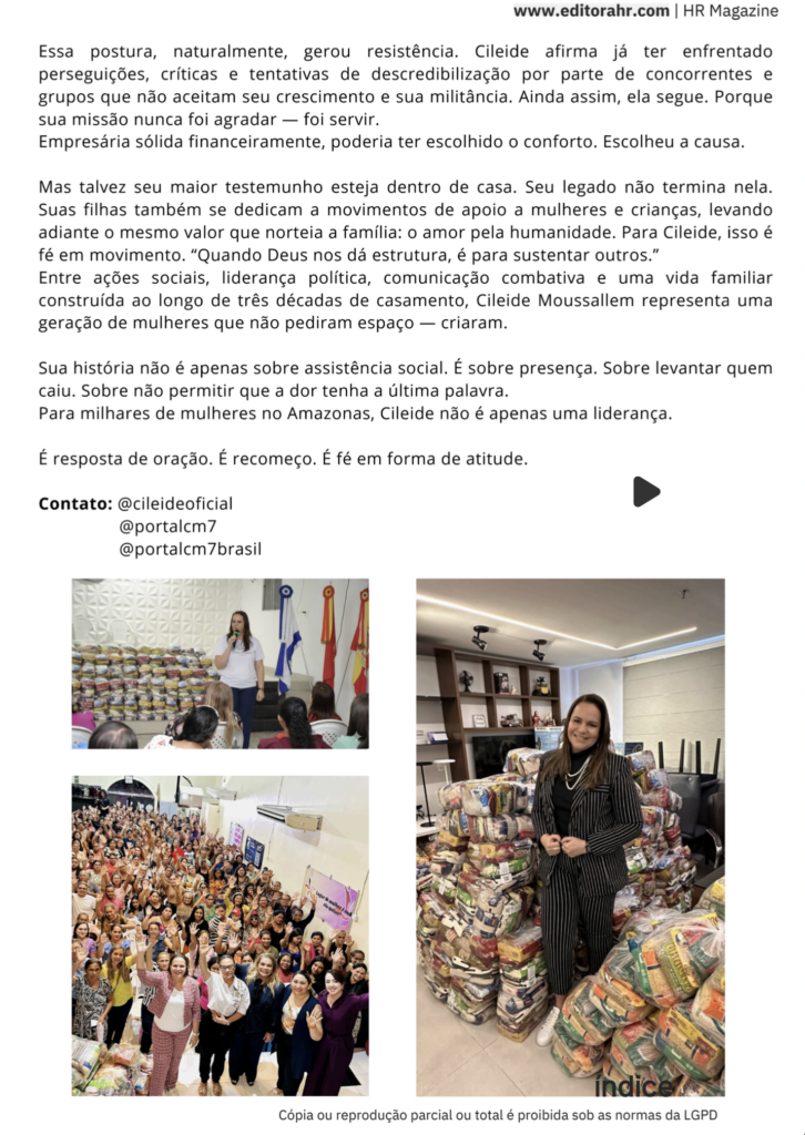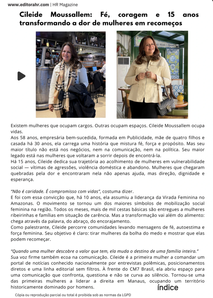 Na comunicação, ela também ocupa um espaço de destaque. Cileide é a primeira mulher a comandar um portal de notícias de alcance nacional com linha editorial conhecida por posicionamentos diretos e entrevistas incisivas. À frente do CM7 Brasil, tornou-se uma das vozes femininas mais visíveis da direita em Manaus, em um ambiente historicamente dominado por homens. A exposição e o posicionamento político, segundo relata, trouxeram resistência, críticas e tentativas de descredibilização. Ainda assim, ela afirma seguir firme no propósito de atuar de forma coerente com seus valores. Empresária financeiramente estruturada, poderia ter optado por uma trajetória mais confortável, mas escolheu a atuação social como missão central. O legado, segundo a própria Cileide, também se reflete na família. Suas filhas participam de ações e movimentos de apoio a mulheres e crianças, dando continuidade aos valores que orientam a atuação da mãe. “Quando Deus nos dá estrutura, é para sustentar outros”, resume. Entre ações sociais, comunicação, liderança política e uma vida familiar construída ao longo de 30 anos de casamento, Cileide Moussallem representa um perfil de liderança feminina que não espera espaço, mas o constrói. Sua história, como destaca a HR Magazine, vai além da assistência social: é sobre presença, reconstrução e a decisão de não permitir que a dor tenha a última palavra.