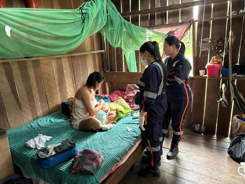 Ao chegar à comunidade, os profissionais constataram que a gestante já havia realizado um parto normal em casa. Imediatamente, a equipe iniciou os procedimentos de avaliação e assistência à mãe e ao recém-nascido, realizando exames clínicos iniciais, verificação dos sinais vitais do bebê, monitoramento do pós-parto e os cuidados necessários para garantir a segurança de ambos.