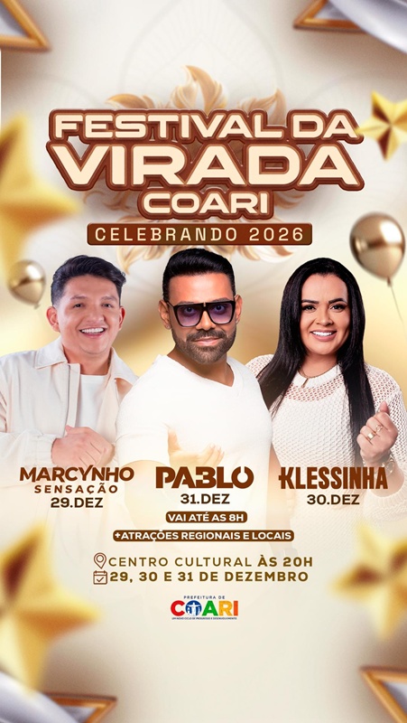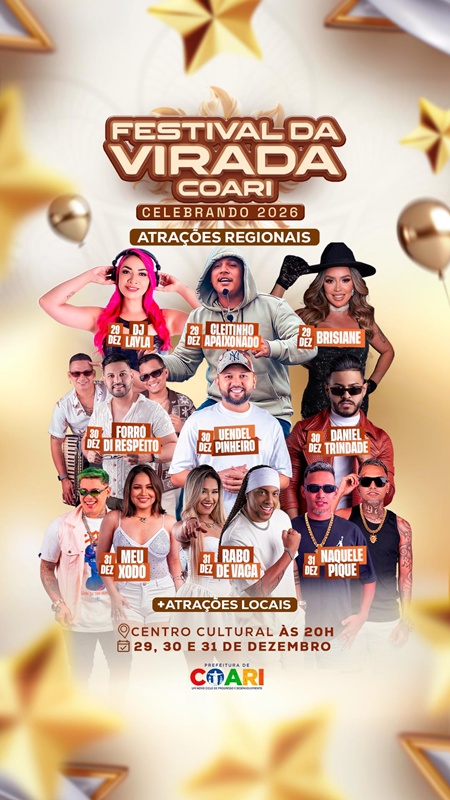 A contagem regressiva para o novo ano já começou, e Coari se prepara para viver três noites de muita música, alegria e celebração com o Festival da Virada Coari – Celebrando 2026. Promovido pela Prefeitura, o evento será realizado nos dias 29, 30 e 31 de dezembro, no Centro Cultural, a partir das 20h, com uma programação gratuita que reúne atrações nacionais, regionais e locais.