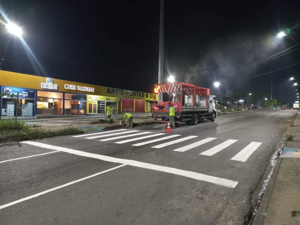 Na zona Centro-Sul, os trabalhos avançam pelos bairros Adrianópolis e Parque 10, contemplando as ruas São Luís, Salvador, André Araújo, Umberto Calderaro, Fortaleza e Teresina, além da avenida Major Gabriel, no Centro. As equipes realizam novas demarcações de faixas de pedestres, linhas de retenção e setas direcionais, ampliando a segurança viária e reforçando a orientação aos motoristas.